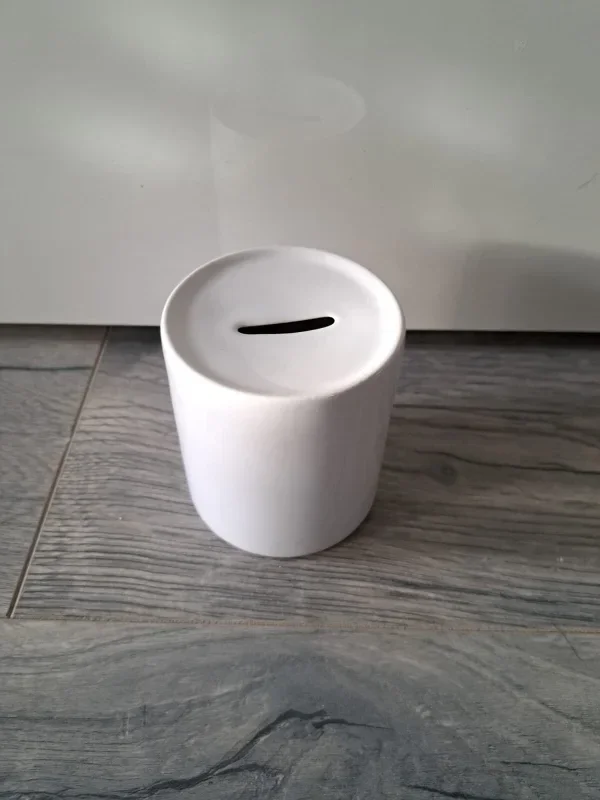 Deze sublimatie spaarpot is gemaakt van wit keramiek en heeft een transparante polymeercoating. Aan de onderkant zit een rubberen dop zodat je het spaargeld er gemakkelijk uit kunt halen.